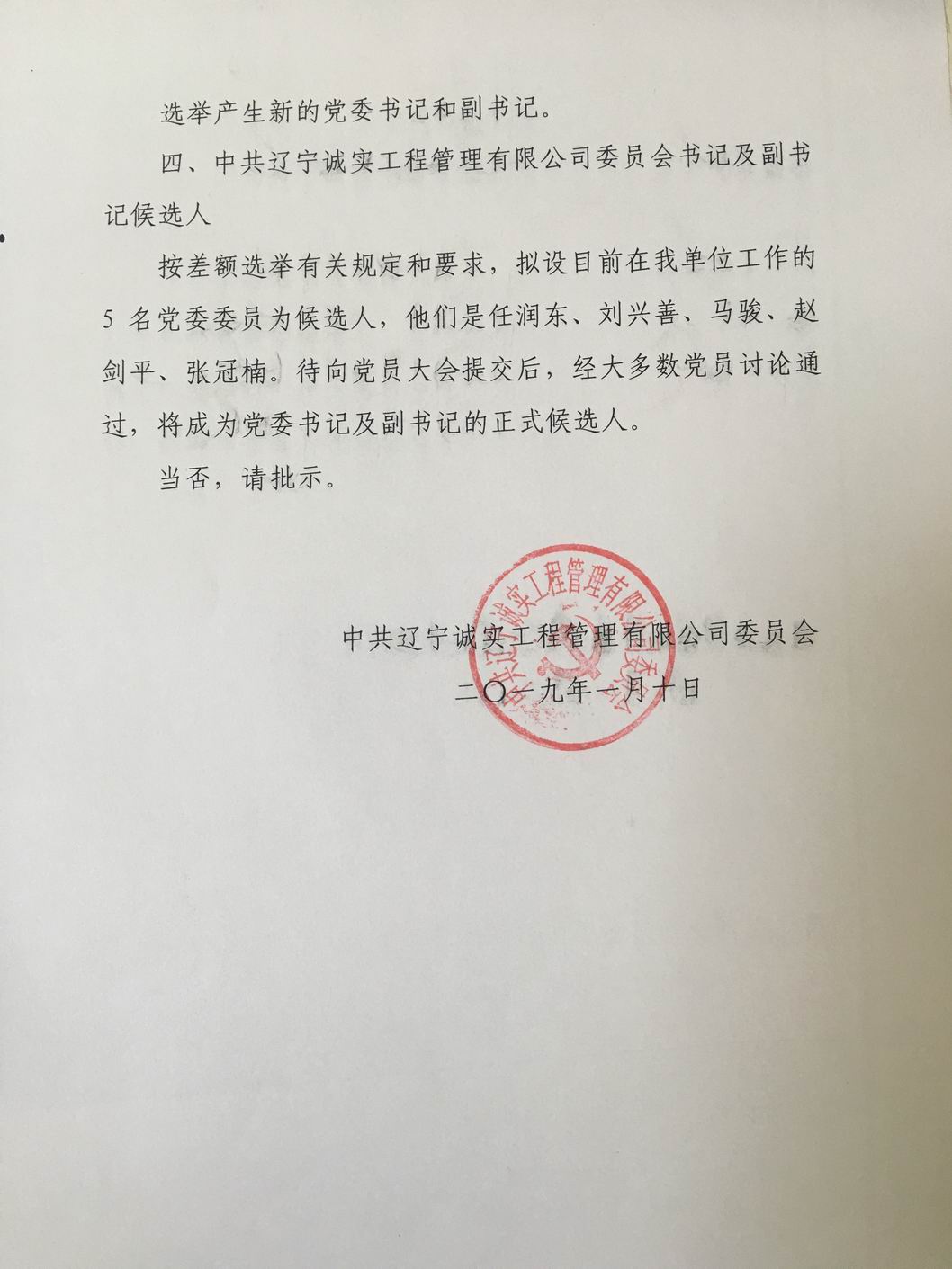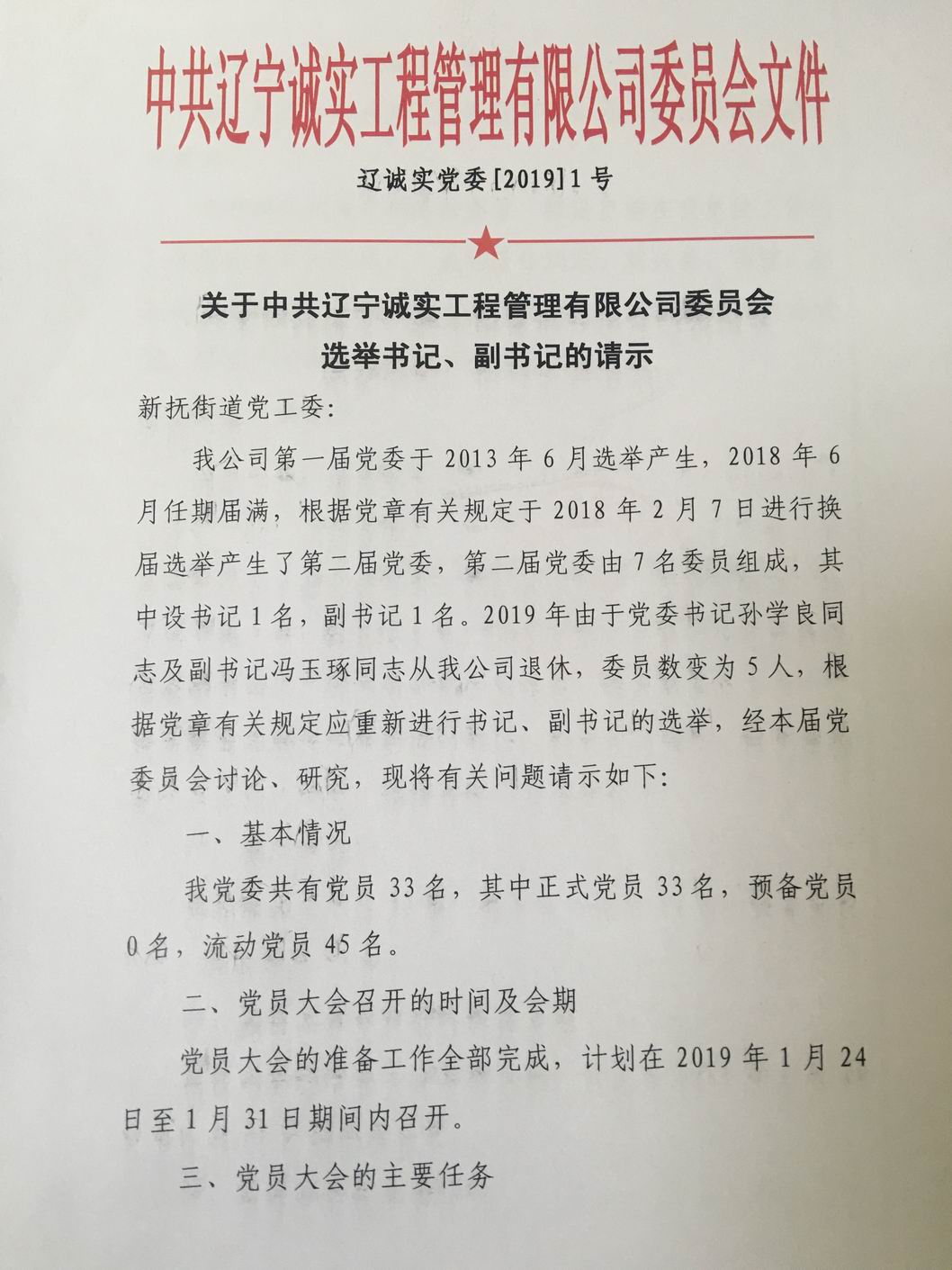 我公司第一屆黨委于2013年6月選舉產(chǎn)生,2018年6月任期屆滿,根據(jù)黨章有關(guān)規(guī)定于2018年2月7日進行換屆選舉產(chǎn)生了第二屆黨委,第二屆黨委由7名委員組成,其中設(shè)書記1名,副書記1名。2019年由于黨委書記孫學(xué)良同志及副書記馮玉琢同志從我公司退休,委員數(shù)變?yōu)?人,根據(jù)黨章有關(guān)規(guī)定應(yīng)重新進行書記、副書記的選舉。我公司于2019年1月10日申請換屆,并于2019年1月16日得到批復(fù)。