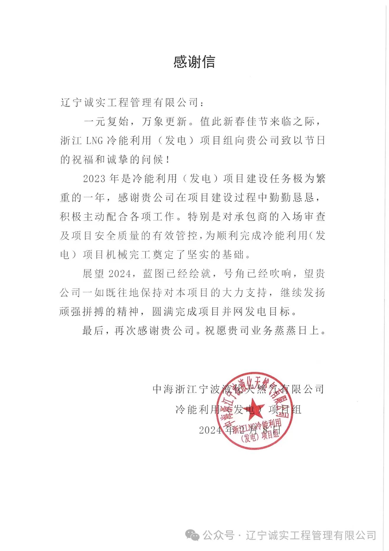 浙江LNG冷能利用(發(fā)電)項目組向公司發(fā)來了感謝信,信中肯定了公司項目部人員在2023年的努力,特別是對于承包商入場審查及項目安全質量的有效管控,為項目機械完工奠定了堅實的基礎。該項目是積極響應國家及浙江省“十四五”規(guī)劃的節(jié)能減排政策,落實“綠色低碳”發(fā)展戰(zhàn)略的示范項目,項目投產后,預計年凈發(fā)電量約為2408萬度,節(jié)省標準煤超3000tce,年減少CO₂排放可達18000多噸。展望2024年,項目部在黃思敏總監(jiān)的帶領下,將認真執(zhí)行監(jiān)理職責,積極推進項目建設,爭取項目早日建成投產。